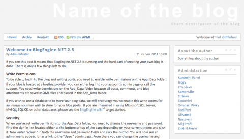 Odkaz na přihlašovací stránku najdete na výchozí domovské stránce BlogEngine.NET v navigační liště. Přihlaste se tedy s výše uvedenými údaji admin/admin. Systém vás pak přesměruje zase na domovskou stránku, kde však již na levé straně uvidíte boxík Administration s odkazy do jednotlivých administračních částí.