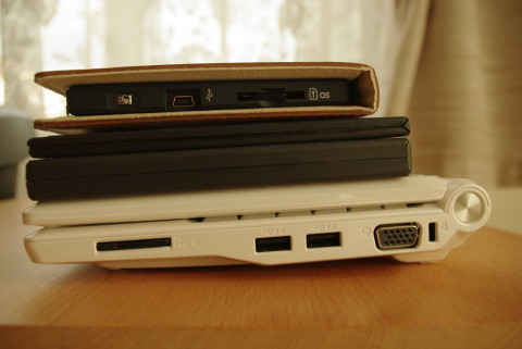 Totéž podruhé, ovšem nyní z profilu: Odshora Hanlin, malý DVD obal, velký DVD obal a úplně vespod ASUS Eee.