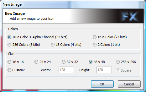 Při vytváření nové ikonky nebo otevírání importovaného obrázku se vás Icofx dotáže na typ vytvářené ikonky. Můžete si vybrat z několika barevných hloubek i velikostí.