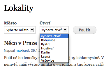 {syntaxhighlighter brush: php;fontsize: 100; first-line: 1; } function _nastavit_ctvrti($key = '') { if ($key && is_numeric($key)){ $query = db_select('taxonomy_term_data', 't'); $query->join('taxonomy_term_hierarchy', 'h', 't.tid = h.tid'); $select = $query ->fields('t', array('tid','name')) ->condition('t.vid',3) ->condition('h.parent',$key) ->orderBy('t.name'); $tids = $select->execute()->fetchAll(); $ctvrte = array(); $ctvrte['All'] = 'vyberte čtvrť'; foreach ($tids as $tid) { $ctvrte[$tid->tid] = $tid->name; } return $ctvrte; } else{ $query = db_select('taxonomy_term_data', 't'); $query->join('taxonomy_term_hierarchy', 'h', 't.tid = h.tid'); $select = $query ->fields('t', array('tid','name')) ->condition('t.vid',3) ->condition('h.parent',0,'>') ->orderBy('t.name'); $tids = $select->execute()->fetchAll(); $ctvrte = array(); $ctvrte['All'] = 'vyberte čtvrť'; foreach ($tids as $tid) { $ctvrte[$tid->tid] = $tid->name; } return $ctvrte; } } {/syntaxhighlighter}Ve výsledku bude výběr vypadat následovně: