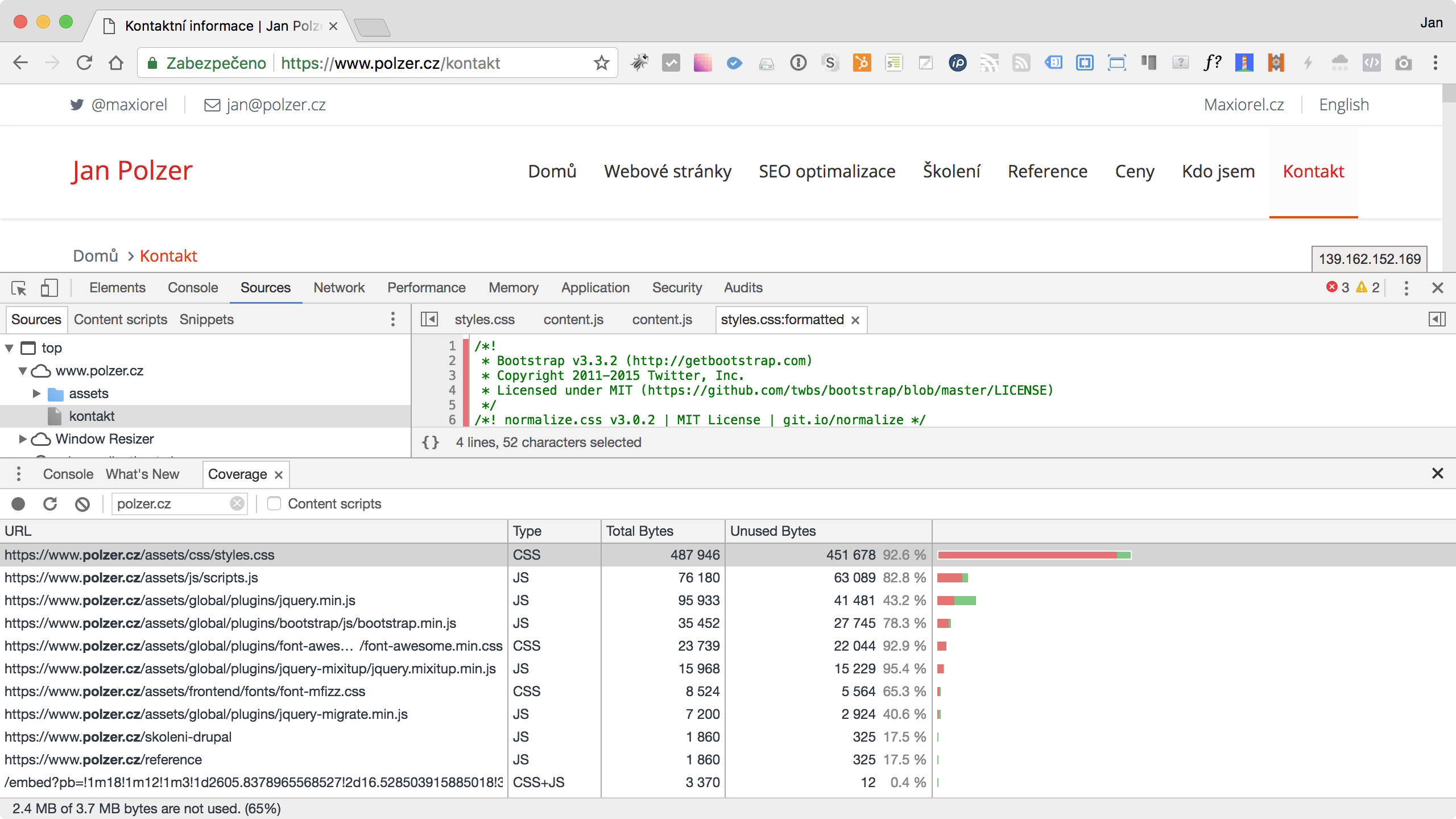 S pomocí webového prohlížeče Chrome si můžete rychle ověřit, kolik nevyužívaného kódu CSS (nebo i JavaScriptu) na svém webu máte: