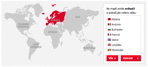 Dlouho jsem přemýšlel nad tím, jak vytvořit mapu světa na titulce a v horní části výpisu Atlasu světa. Dokonce jsem ji dělal až jako poslední. Funguje tak, že si kliknete na kontinent, který vás zajímá a v seznamu na pravé straně se objeví jen odpovídající země. Následně si vyberete a tlačítkem ji zobrazíte.