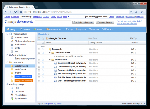 Všimněte si, že záložky jsou ukládány v online aplikaci Google Docs. Tam je najdete pod položkou Moje složky|Google Chrome. Když spustíte synchronizaci na jiném počítači, měli byste tyto záložky dostat i do dalšího prohlížeče. To je z návodu vše.