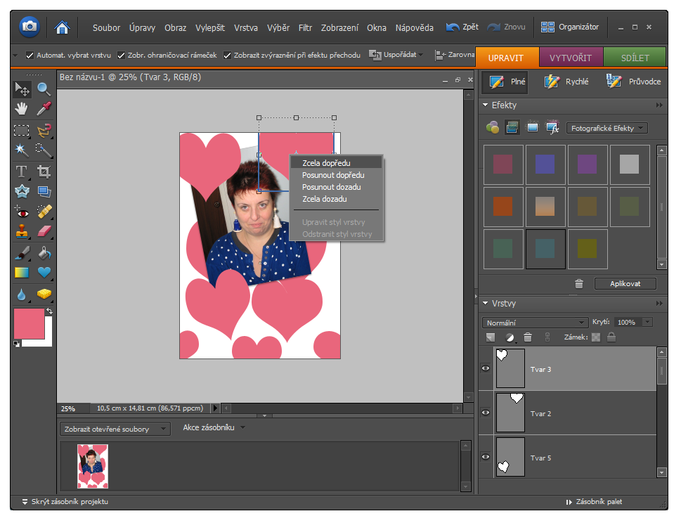 Aby přáníčko trochu lépe vypadalo, zkuste některá srdíčka nechat pod fotografií a jiná zase přesuňte nahoru. Uděláte to tak, že na srdíčko klepněte pravým tlačítkem a vyberete přesun Zcela dopředu.