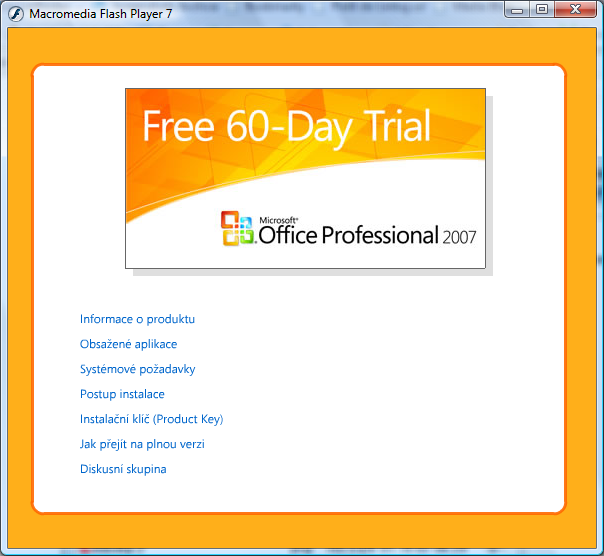 Zkušební verze MS Office Professional 2007 umístěná na tomto CD funguje po bezplatné registraci 60 dnů. Bez registrace umožní pouze 25 spuštění, poté se zablokuje. Registraci je nutné provádět přes internet, počítejte s tím.
