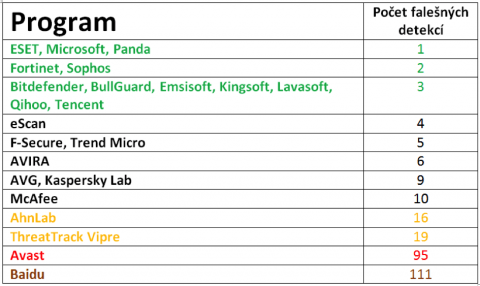 Pravý průšvih nastává zde, přitom Avast neměl dříve s falešnými poplachy žádné problémy. Avast skončil předposlední s tím, že až na Baidu měly všechny ostatní antiviry mnohonásobně méně falešných hlášení. Avast s počtem 95 je opravdový extrém, už i AhnLab s 16 hlášenými omyly je označen jako propadák, respektive je tento počet poplachů označen jako „hodně“. Baidu se svými 111 pak přísluší titul „šíleně mnoho falešných poplachů“. Výsledky najdete opět v tabulce.