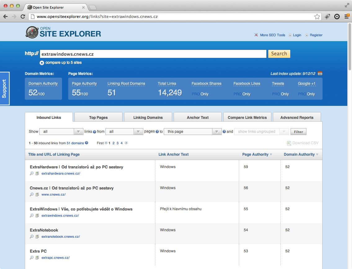 Compare Link Metrics zobrazí přehled s údaji jako jsou MozRank, MozTrust, počty interních a externích zpětných odkazů, rozdělení odkazovačů podle C bloků IP adres a mnoho dalšího. V případě placené verze je navíc nabídnut export dat do CSV pro následné zpracování třeba v Excelu.