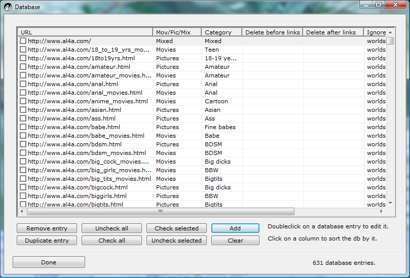 Jakmile je stahování dokončeno nebo je dosažen limit počtu stahovaných souborů, můžete průběhový dialog zavřít. Vrtá vám hlavou, odkud PornBot bere adresy pro stahování souborů? V tom případě se musíte podívat do jeho nastavení. V nabídce Options | Database najdete přes šest stovek odkazů na weby, kde lze nalézt pravidelně aktualizovaný obsah dostupný zdarma: