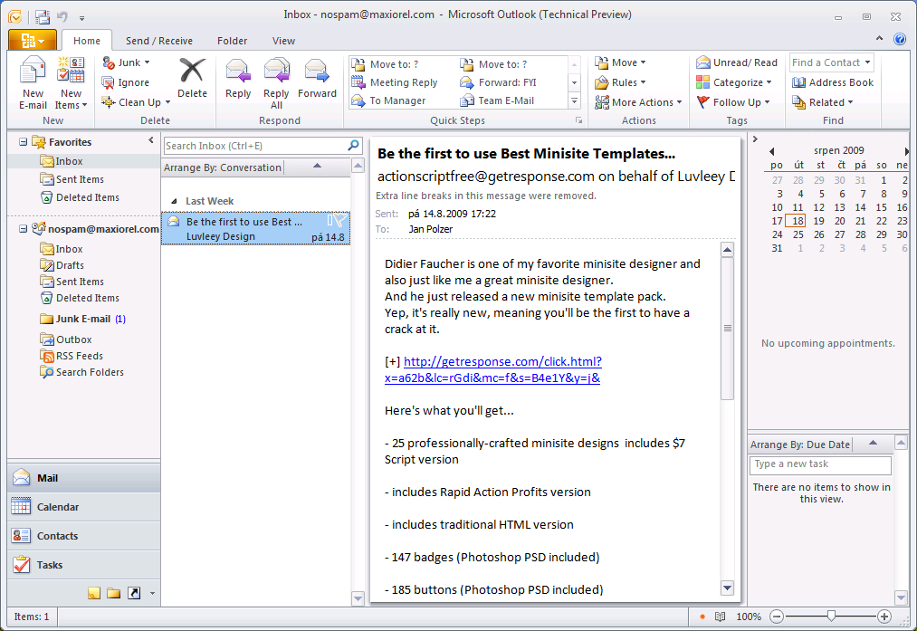 Jinak, funkčně je na tom základní okno v podstatě stejně, jako předchozí verze Outlooku, novinkou je především pás karet a jiné uspořádání tlačítek. Co se mi ještě líbí, je tlačítko pro rychlé přepínání stavu zprávy mezi přečtenou a nepřečtenou.