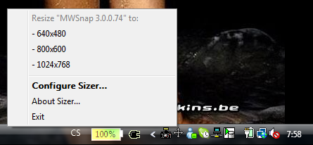 Se změnou rozměrů vybraného okna programu vám pomůže jednoduchý freewarový nástroj Sizer. Po instalaci se usídlí v systémové liště pod ikonkou přesouvacího kříže. Nyní stačí vybrat nějaké okno a na tuto ikonku klepnout pravým tlačítkem myši. Zobrazí se kontextová nabídka, ve které najdete několik vybraných rozměrů - stačí si vybrat.