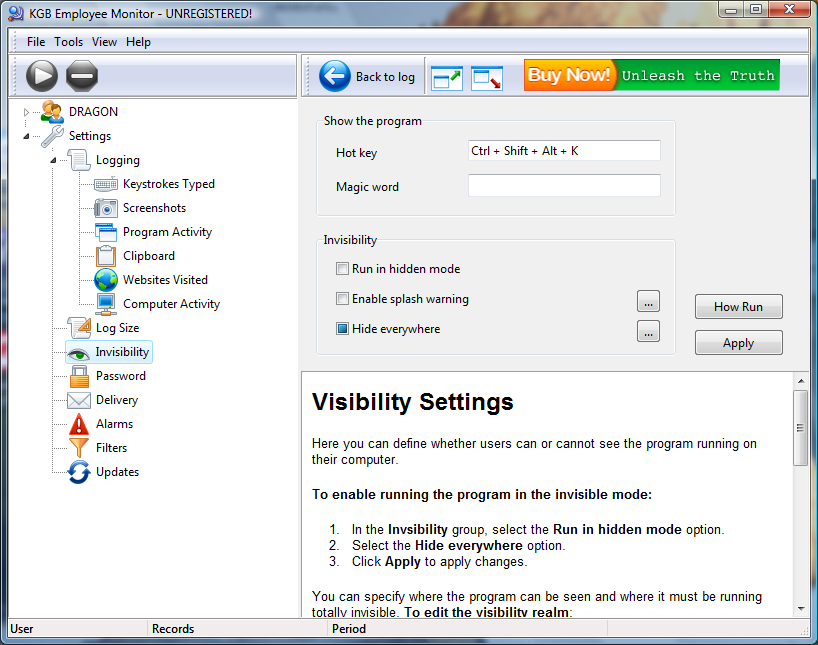KGB Employee Monitor samozřejmě běží na pozadí, takže běžný uživatel jeho přítomnost nezjistí. Pokud si pohrajete s jeho nastavením, pak můžete sledovat aktivitu uživatele pouze ve vybraných aplikacích. Po instalaci se program spouští v tzv. tichém režimu, kdy jste o jeho aktivitě informování pouze prostřednictvím informačních e-mailů, ve kterých je shrnuta veškerá aktivita sledovaného uživatele. Informace lze nahrávat také na FTP. Specialitou je informování administrátora v případě, že sledovaný uživatel použije předem definované klíčové slovo.