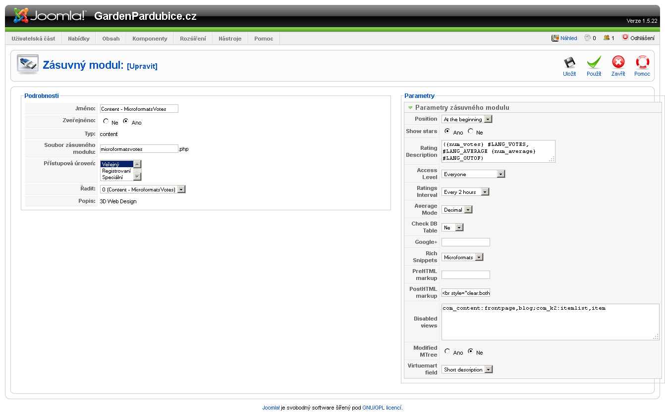 Plugin v podstatě nahrazuje standardní hodnocení obsahu v Joomla! - je tedy třeba původni hodnocení zneaktivnit, protože jinak by se vám na stránce zobrazovala možnost hodnotit dvakrát. Ovšem pouze hodnocení od Microformats seo votes se umí odesílat na Google.