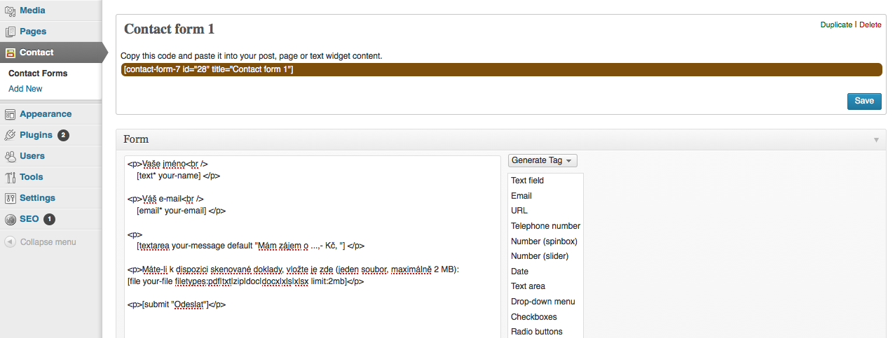 Definice formuláře neprobíhá vizuální cestou, ale pomocí HTML, do kterého vkládáte nahrazovací vzorky vykreslující při zobrazení stránky samotný formulář. Contact Form 7 umí celou řadu typů políček, včetně nahrávání souboru s omezením určitých přípon a velikosti.
