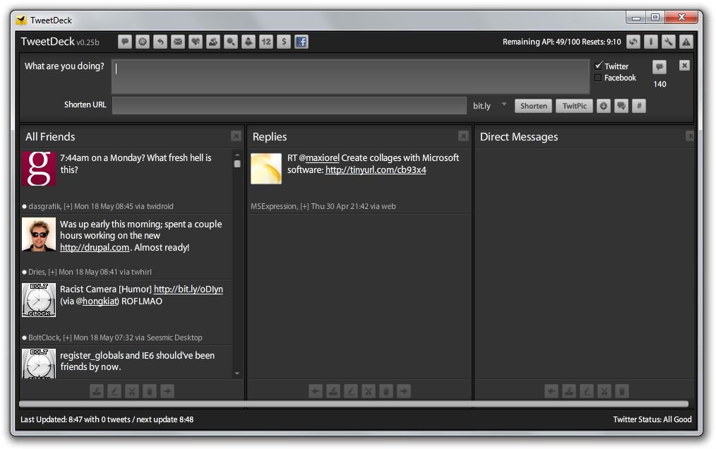 Jednou z těch povedenějších aplikací je TweetDeck - program vytvořený pro platformu Adobe Air fungující hned v několika operačních systémech. TweetDeck zobrazuje ve sloupcích zprávy od uživatelů, které následujete, odpovědi na vaše příspěvky, vzkazy od ostatních, skupiny, vyhledávání a řadu dalších - jednotlivé prvky si zapínáte pomocí tlačítek v horní části okna programu.