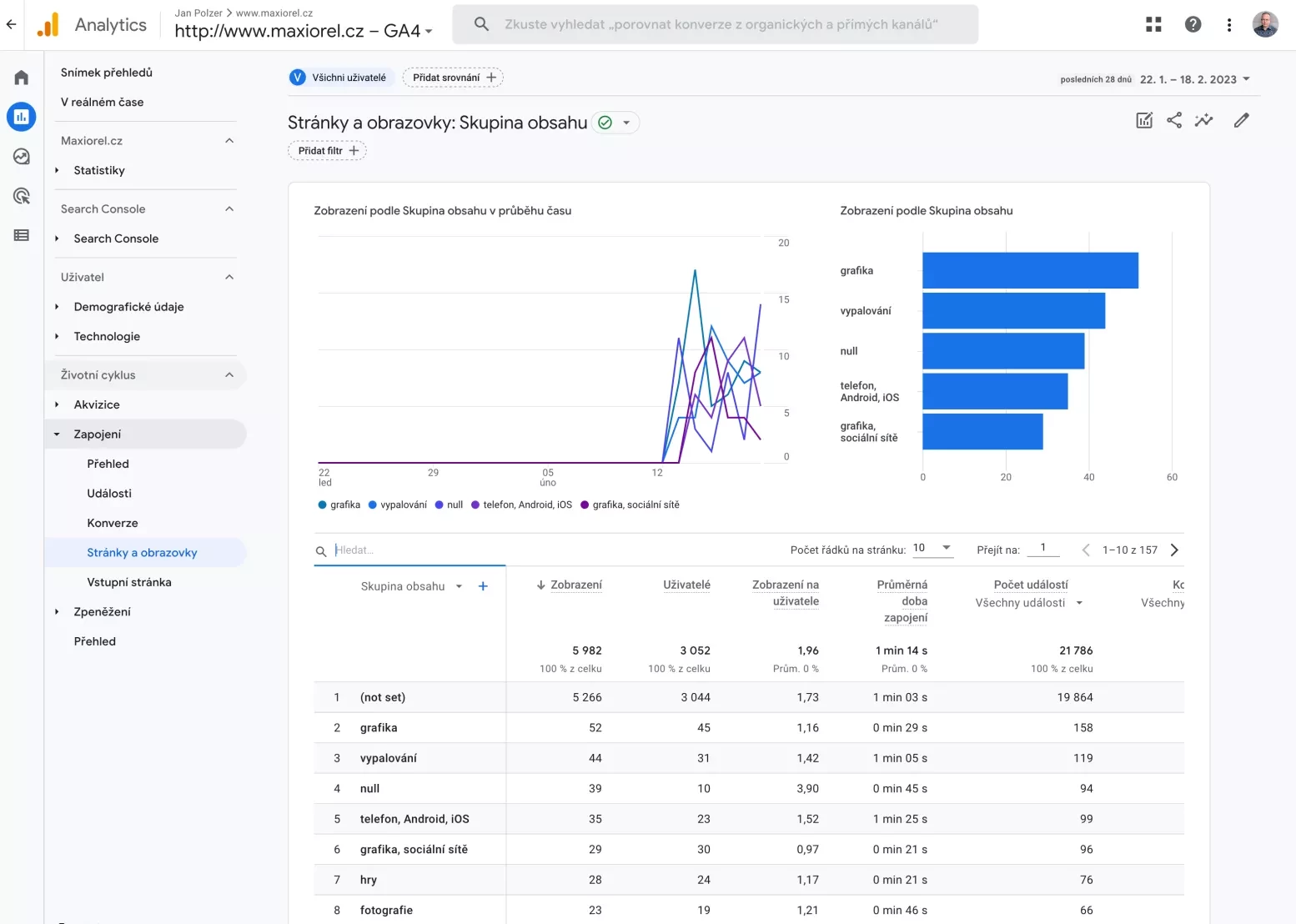Doufejme, že všechny předchozí kroky se povedly a nenastal někde problém. Pokud se nyní přihlásíte do svých Google Analytics a podíváte do se přehledů, měli byste skupiny obsahu najít. Konkrétně jde o přehled Životní cyklus > Zapojení > Stránky a obrazovky.